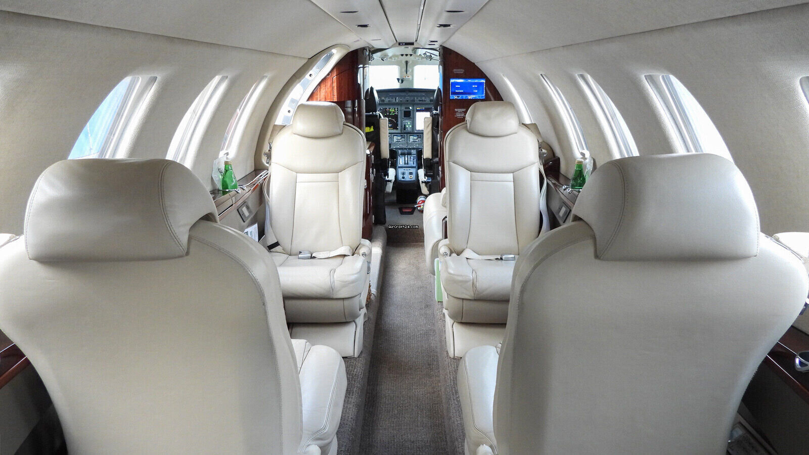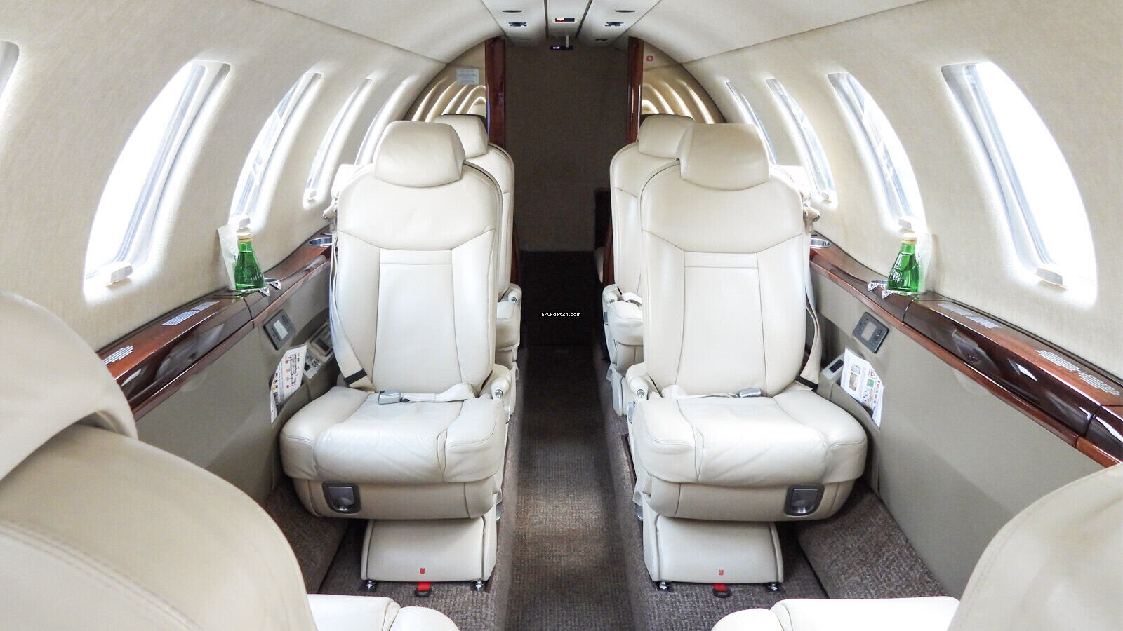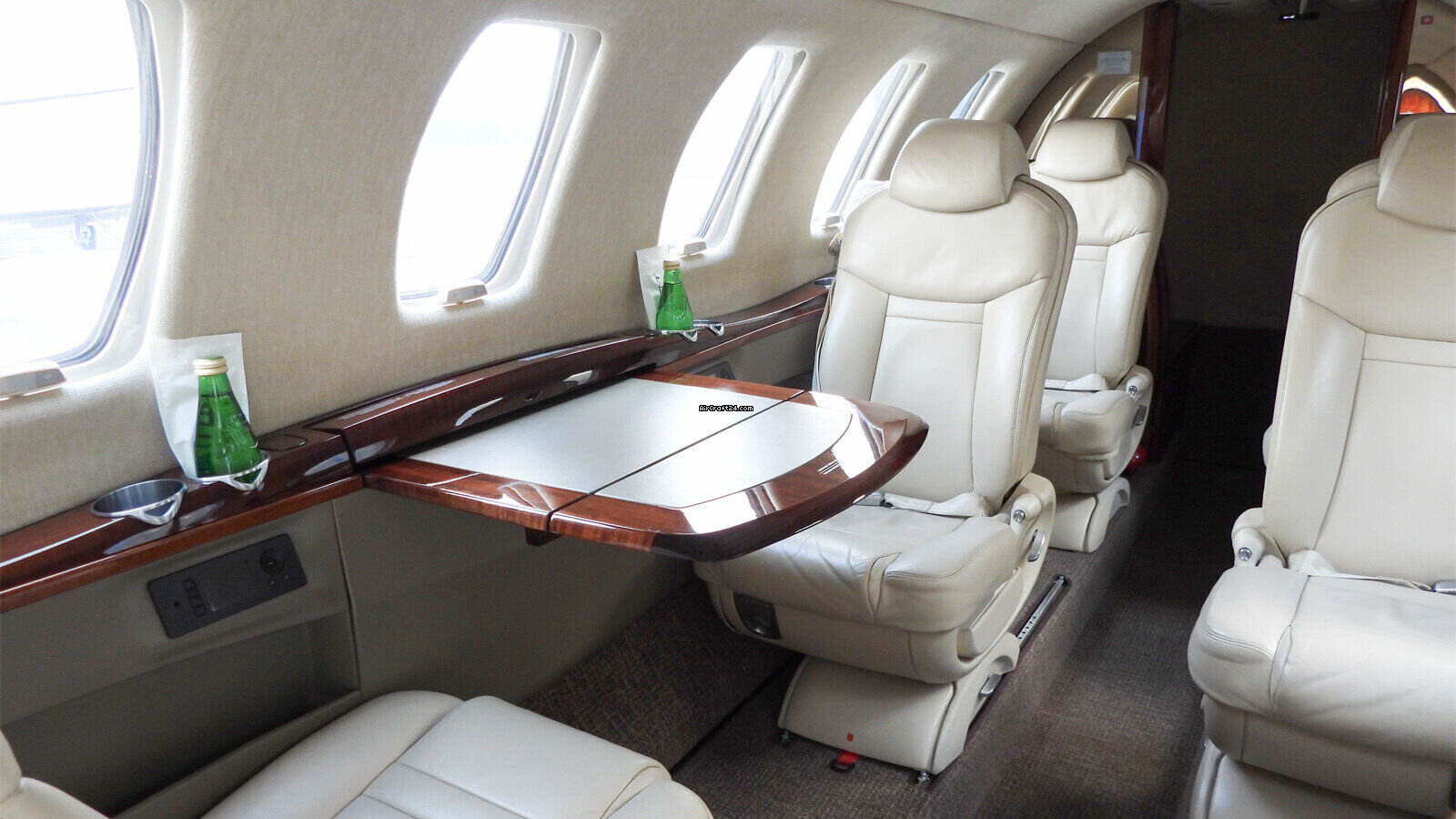 | Intérieur | | 2 Crew-, 4 Club Seats; 2 single fwd. Seats, double seat Divan (Couch) and belted Toilet Seat (max. 9 Pax), AC Power Outlets, Lavatory with sliding door for privacy, 2 additional foldable Pax Tables on seat 7 & 8, Satcom Telephone, GoGo Advance L3 Wi-Fi, Airshow with Media Center and 2 additional Screens. |