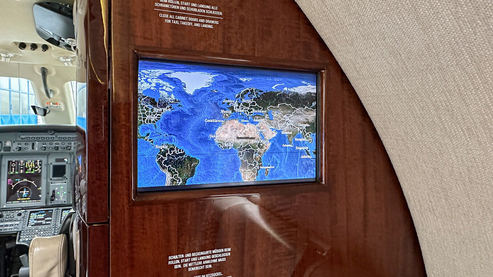 | Equipement | | Second FMS 3000, HF with SELCAL (provisions), CVR/FDR, TCAS II, EGPWS Mark VIII, upgraded AirStair, SATCOM, Jeppesen E-Charts (IFIS File Server), Multi-Scan Weather Radar, TCAS II, Mark VIII EGPWS, Cabin Display (Airshow) with 2 additional Screens, belted Toilet Seat with sliding Door, AC Power outlets. |