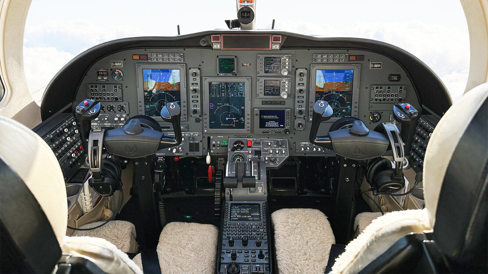 | Intérieur | | Six (6) passenger executive seating in beige leather (four club seating, two single fwd. facing seats), one side facing seat (7) plus belted lav seat (8), brown carpet, brown wood veneer (gloss laminate), lavatory separated by a sliding door for privacy, slim refreshment center (hot Cup), brushed aluminum hardware, Cabin information Display (AvVisor Plus), 110 V AC Cabin and Cockpit power outlets |
