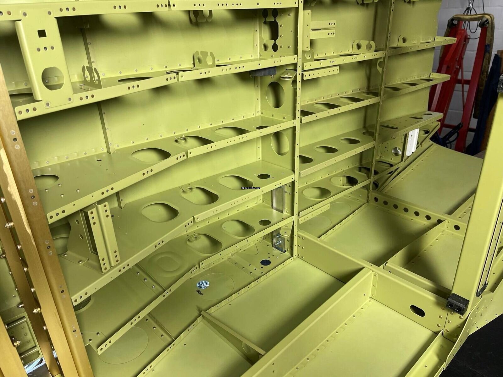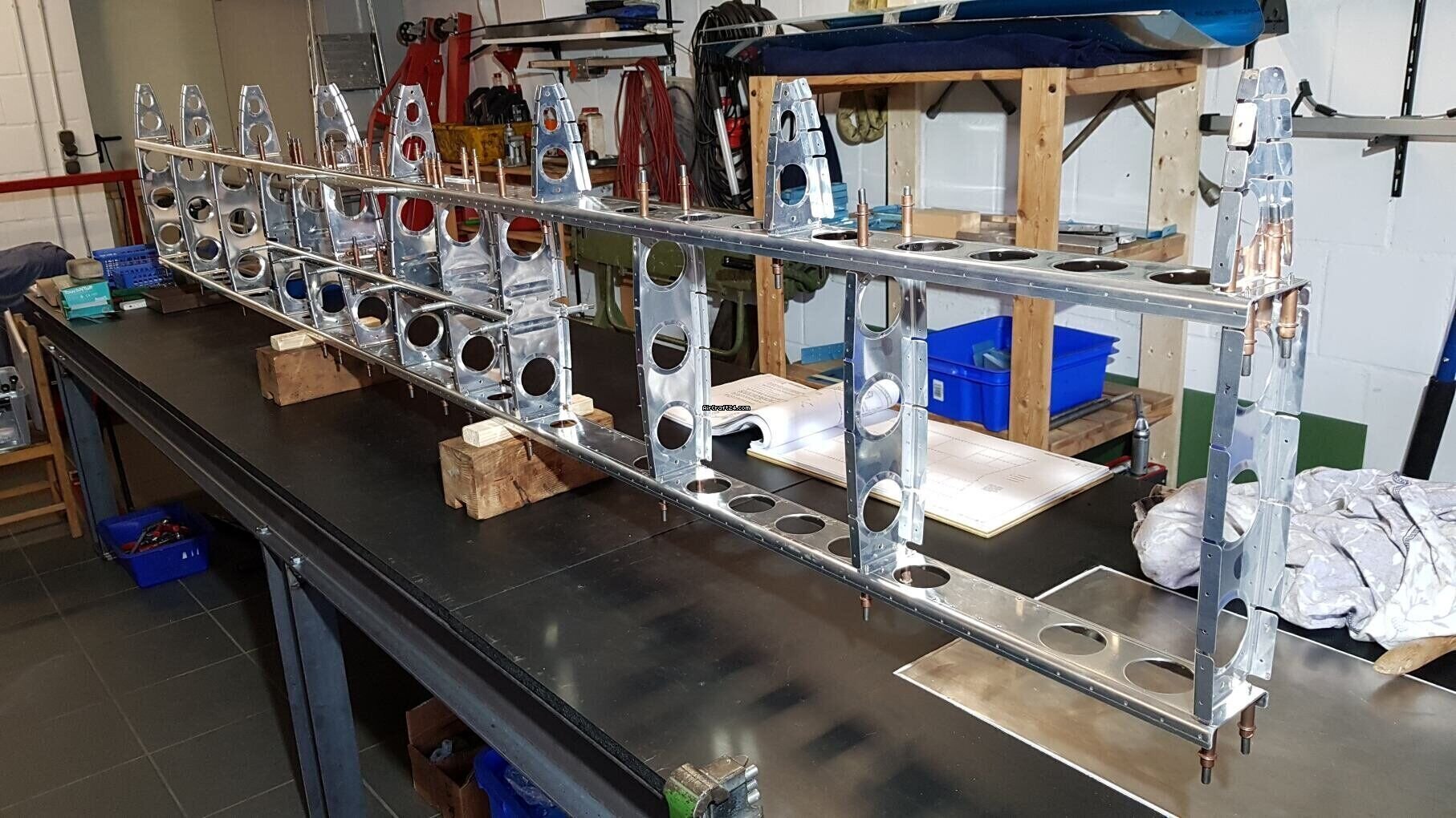 Das Höhenleitwerk, das Seitenruder sowie der vordere Rumpfabschnitt sind teilweise fertiggestellt. Alle bisher ausgeführten Arbeiten wurden äußerst sorgfältig von erfahrenen RV-Erbauern durchgeführt. Sämtliche Bauteile wurden zur Korrosionsvorsorge alodined und anschließend mit einem luftfahrtzugelassenen Epoxidprimer von Akzo Nobel beschichtet.