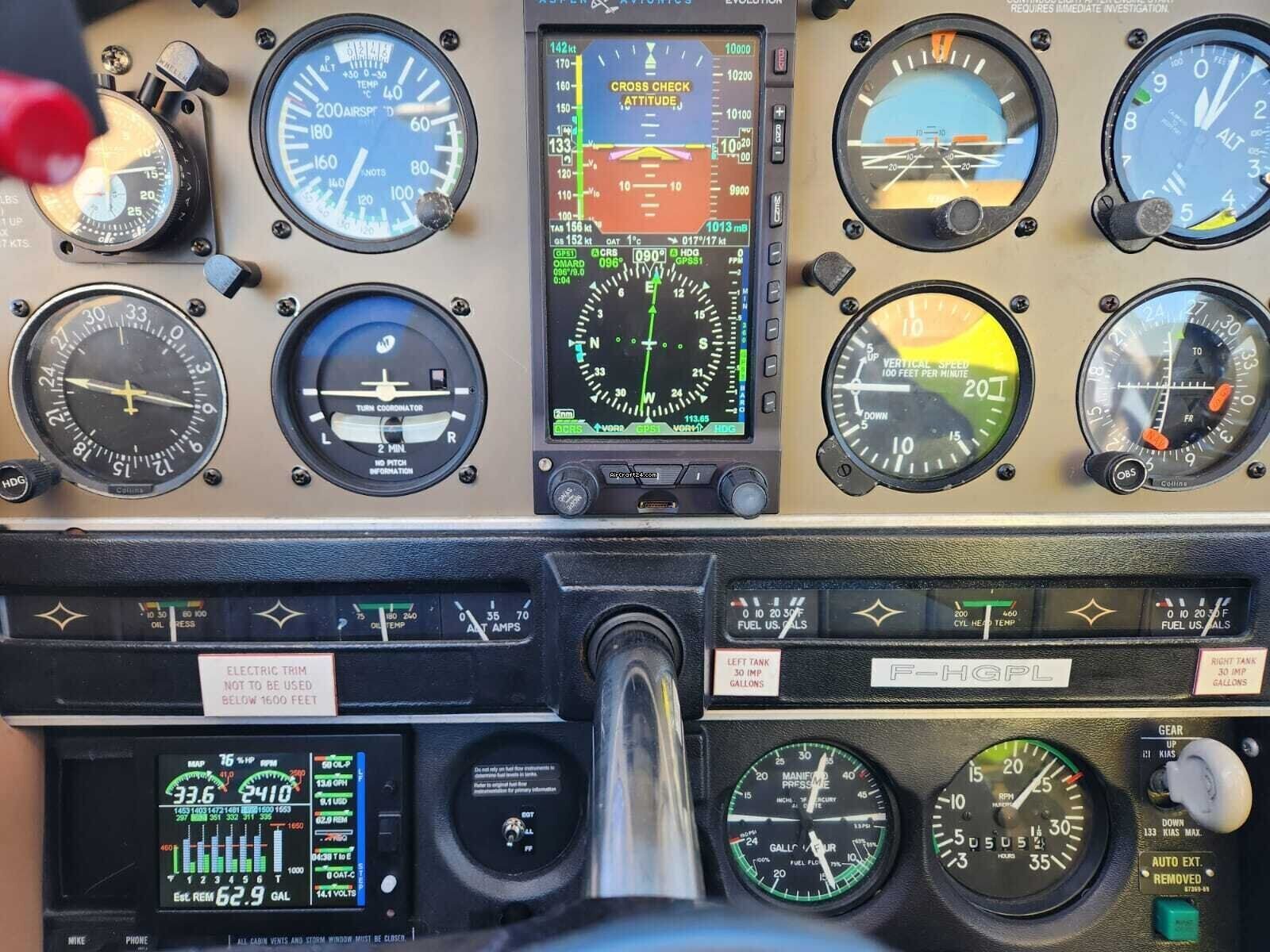 | Avionique | | Avionics: ASPEN EFD 1000 PRO, GTN 650 with WIFI & Bluetooth, PA STEC 55X, ADF, DME KN26A, GTX 330, EDM 830 (engine surv./param. recording), 2nd KX165 radio, 2nd VOR-ILS. Horizon redundancy, turn indicator. |